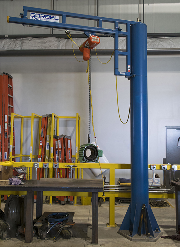 La grúa giratoria WSJ360 se ancla al piso sin cimientos especiales, gira 360°, soporta hasta 453 kg y alcanza 4.9 m.